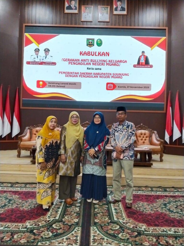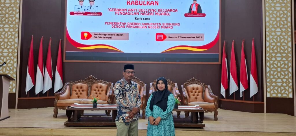 Kamang_Humas (27/11/25) – Dukung Upaya Pencegahan Perundungan, Kepala MTsN 5 Sijunjung Wan Eka Putra bersama Guru BK Junialis Hadiri Kegiatan KABULKAN (Gerakan Anti Bullying Keluarga Pengadilan Negeri Muaro) yang bekerja sama dengan Pemerintah Daerah Kabupaten Sijunjung (Dinas Sosial Pemberdayaan Perempuan dan Perlindungan Anak) bertempat di Balairung Lansek Manih Kantor Bupati Sijunjung, Kamis (27/11/2025)