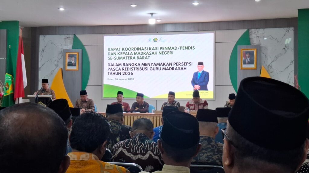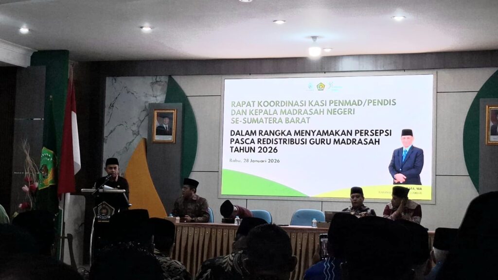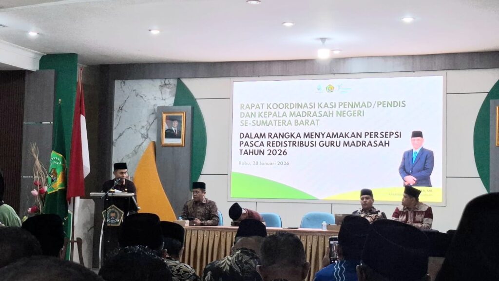 Kamang_Humas (28/01/26) — Kepala MTsN 5 Sijunjung Wan Eka Putra mengikuti kegiatan Rapat Koordinasi (Rakor) yang melibatkan Kasi Pendidikan Madrasah (Penmad), Pendidikan Islam (Pendis), serta para Kepala Madrasah Negeri se-Sumatera Barat, Rabu (28/01/2026), di Aula Amal Bhakti I Kanwil Kemenag Provinsi Sumatera Barat.
