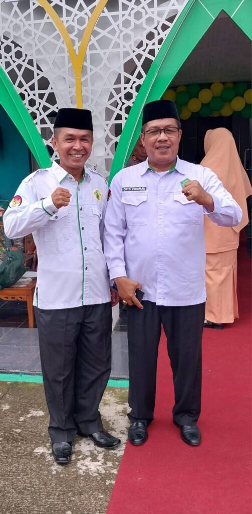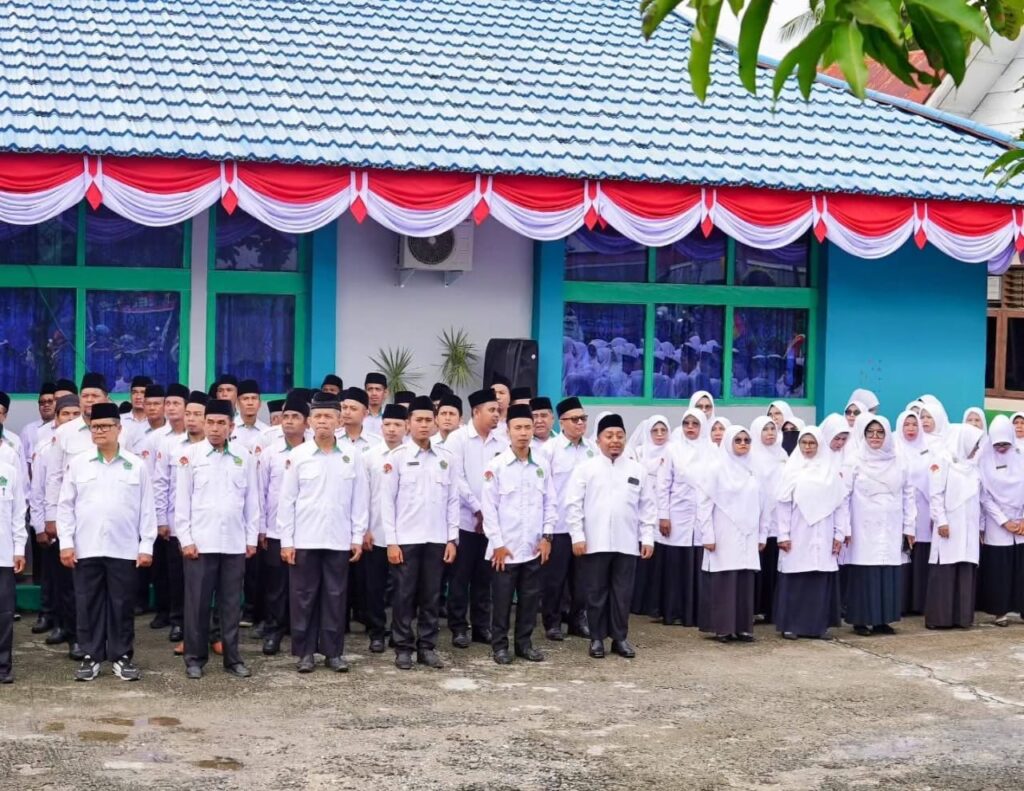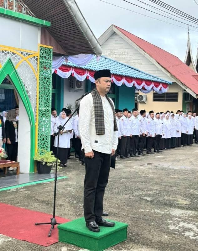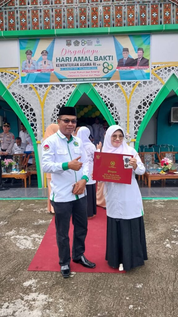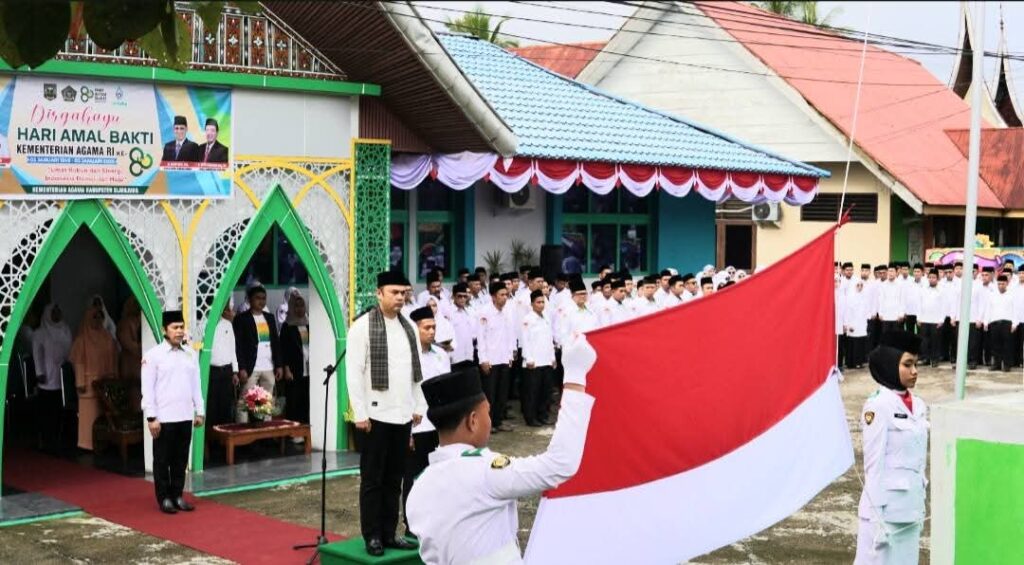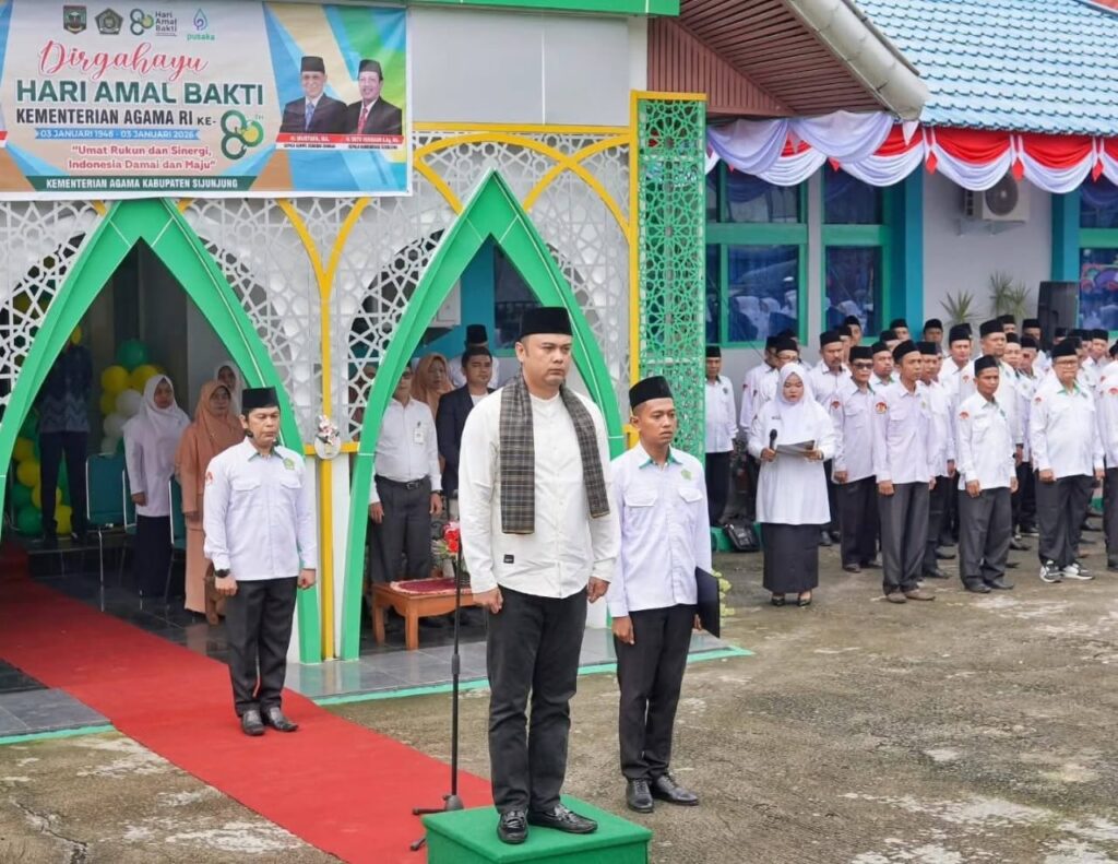 Kamang_Humas (03/01/26) — Kepala Madrasah Tsanawiyah Negeri (MTsN) 5 Sijunjung Wan Eka Putra bersama dengan Ketua DWP Unit Ny.Elfi Wan Eka Putra, mengikuti Upacara Peringatan Hari Amal Bakti (HAB) Kementerian Agama Republik Indonesia ke-80 tahun 2026 yang dilaksanakan di halaman Kantor Kementerian Agama Kabupaten Sijunjung, Sabtu(3/1/2026).