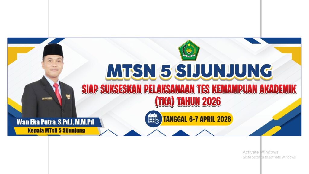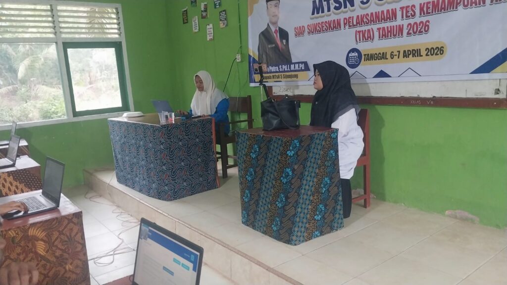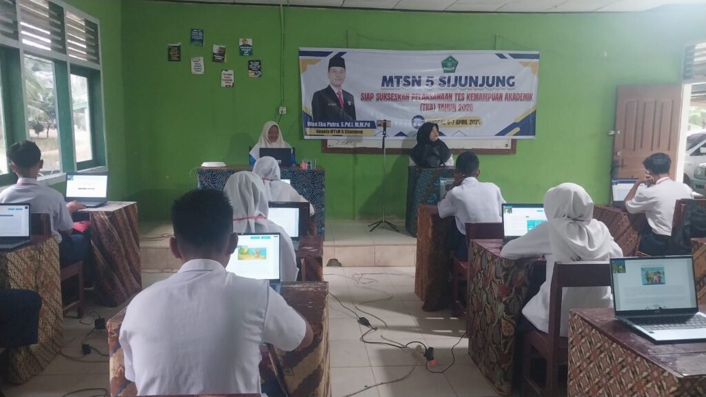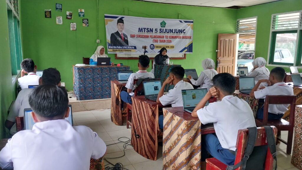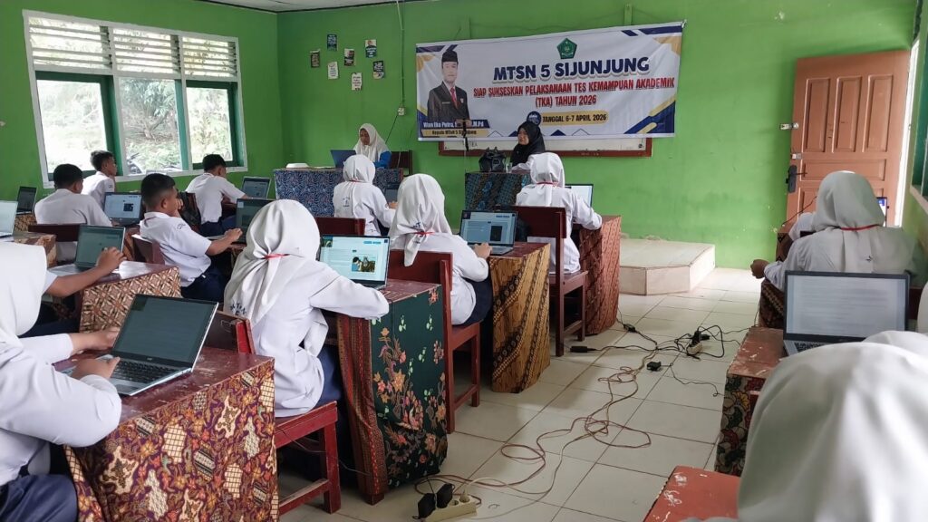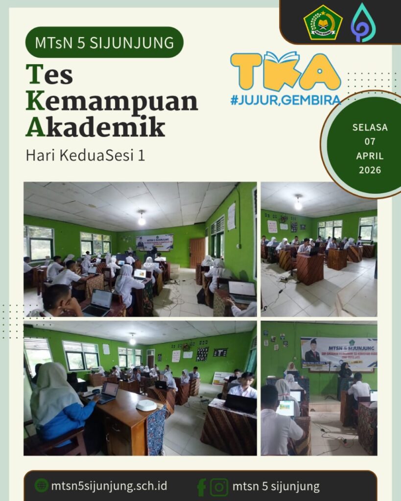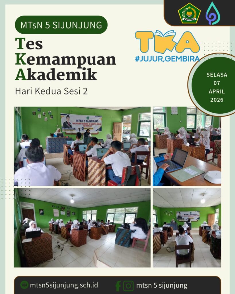 Kamang_Humas (07/04/26) — Pelaksanaan Tes Kemampuan Akademik (TKA) Tahun 2026 di MTsN 5 Sijunjung berlangsung dengan aman, tertib, dan lancar. Kegiatan ini dilaksanakan selama 2 hari yaitu senin dan selasa (06 dan 7 April 2026), diikuti oleh seluruh siswa kelas IX yang berjumlah 34 orang sebagai bagian dari evaluasi capaian pembelajaran selama menempuh pendidikan di madrasah tersebut.