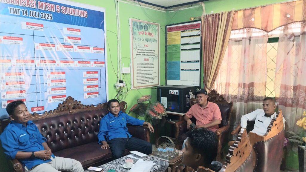 Kamang_Humas (03/02/26) — MTsN 5 Sijunjung menerima kunjungan silaturrahmi dari Pengurus Masjid Darul Jadid Batang Kariang Nagari Kamang dalam suasana penuh keakraban dan kekeluargaan. Kegiatan ini berlangsung di ruang Kepala Madrasah dan disambut langsung oleh Kepala Madrasah Wan Eka Putra beserta Kaur.TU Sudurdin dan Staf TU Daswarman, Selasa (03/02/2026)